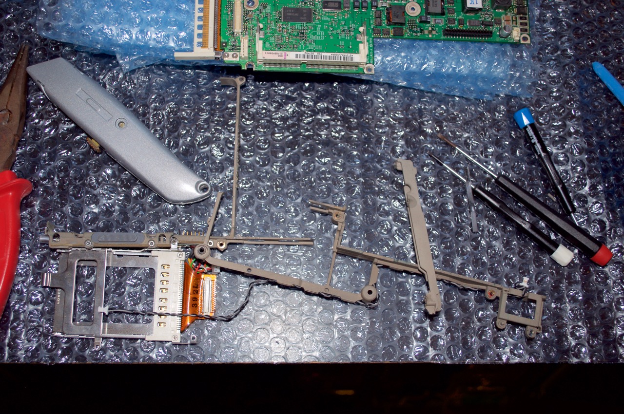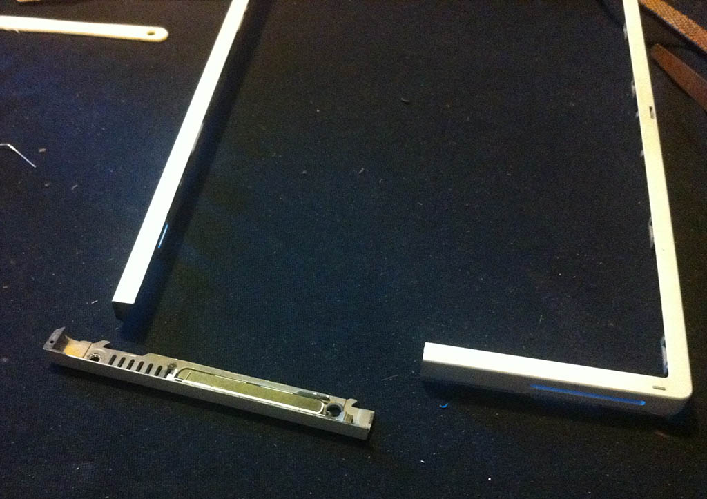 - Take the LCD panel out of the display assembly with broken hinges from the 867 (1280x854 resolution) and install into the Aluminum 1.0Ghz model (which was 1152x768 res prior to the damage).