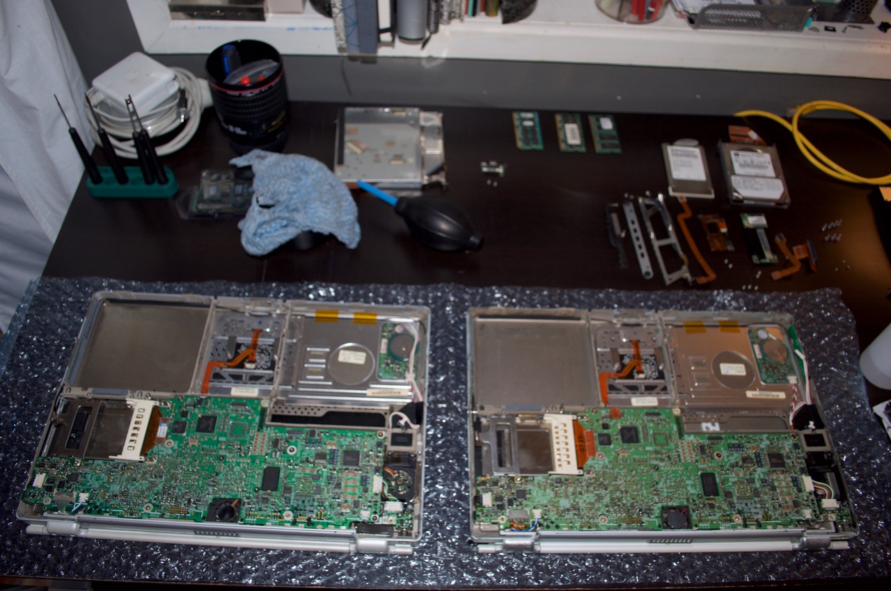 - PowerBook G4 Titanium 667Mhz - This is our honorable donor. Currently not booting. There are a few missing resistors on the logic board near the power input preventing the board from powering on. The display assembly appears to be OK, as does the Combo drive. It is externally in pretty good shape.