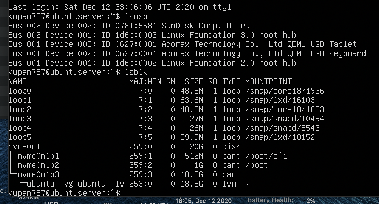 Code:macbookair:~ kupan787$ lsusb Bus 000 Device 002: ID 0781:5581 SanDisk Corporation Ultra Serial: 4C530001021027120270 Bus 000 Device 000: ID 0781:5581 SanDisk Corporation USB 3.1 Bus