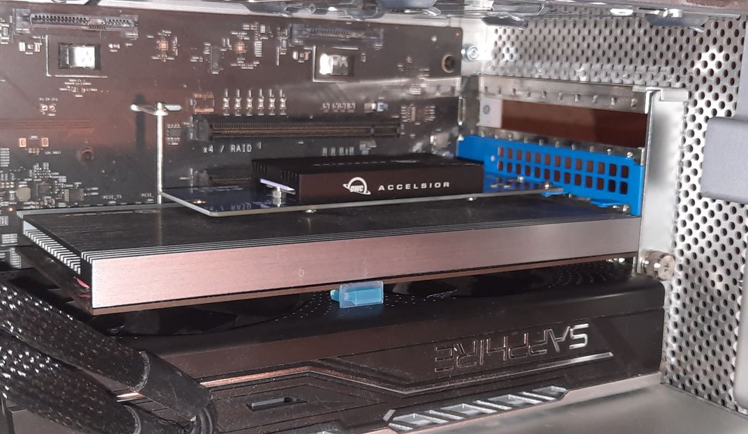 I have the similar configuration, Syba + NVMe 970 EVOPlus (slot 2) and Radeon VII (slot 1) but, as you can see in the picture attached, the maximum speed for me is only 1400/1500 Mb/s (W/R).I installed the Syba card in slot 2 but had to add a round foam sticker to the video card, to have clearance for the RX580. Is the white foam between the GPU fans, into screenshot. Thank you IKEA for these foam stickers ?