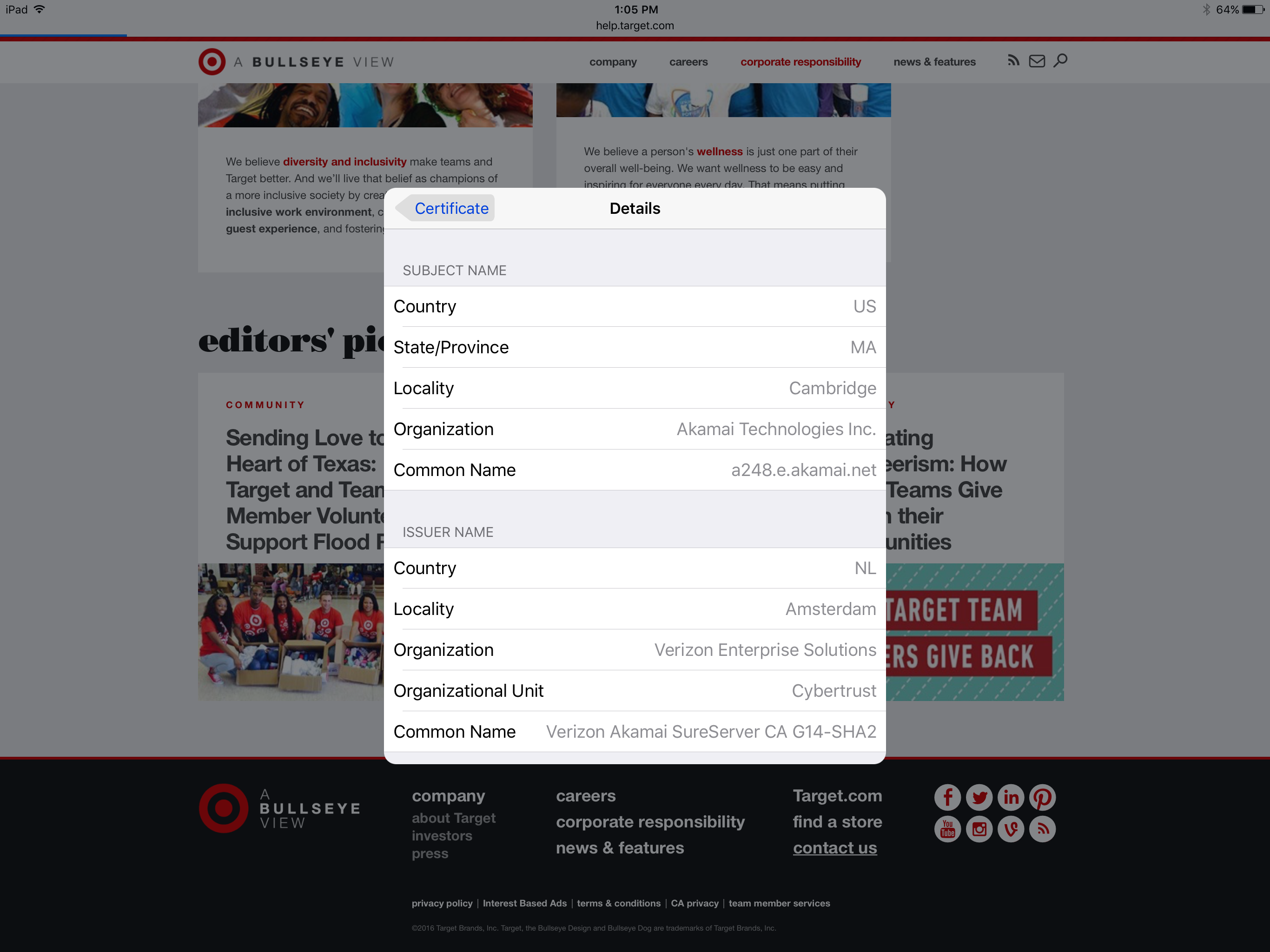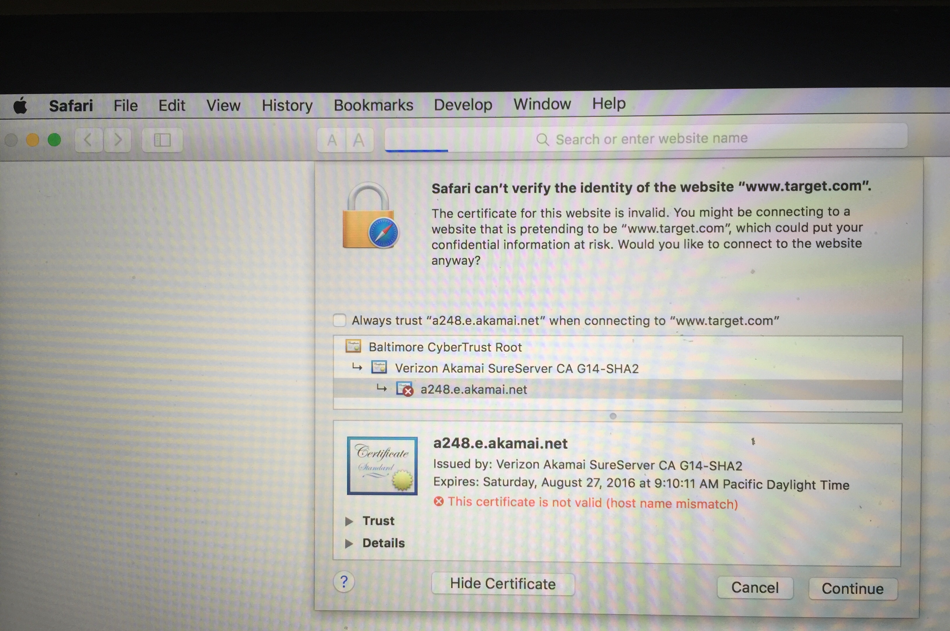 I went to Target's website yesterday thinking I might order something and was met with a trust certificate warning. I was on my Macbook pro retina running 10.11.5 using Safari (up to date). Saw the message below when trying to access the home page. Not savvy about this kind of stuff and was surprised to find this pop up on a large retailer's site. We were caught up in Target's massive hacking a while back, know they were trying to recover public trust and beef up security and so found this especially surprising. Could not find anyway to contact corporate to ask about the website security, and even the local store I called had no way of telling customers how to contact them. They just said "well use it or don't". Comments? Should I not be using their website essentially?