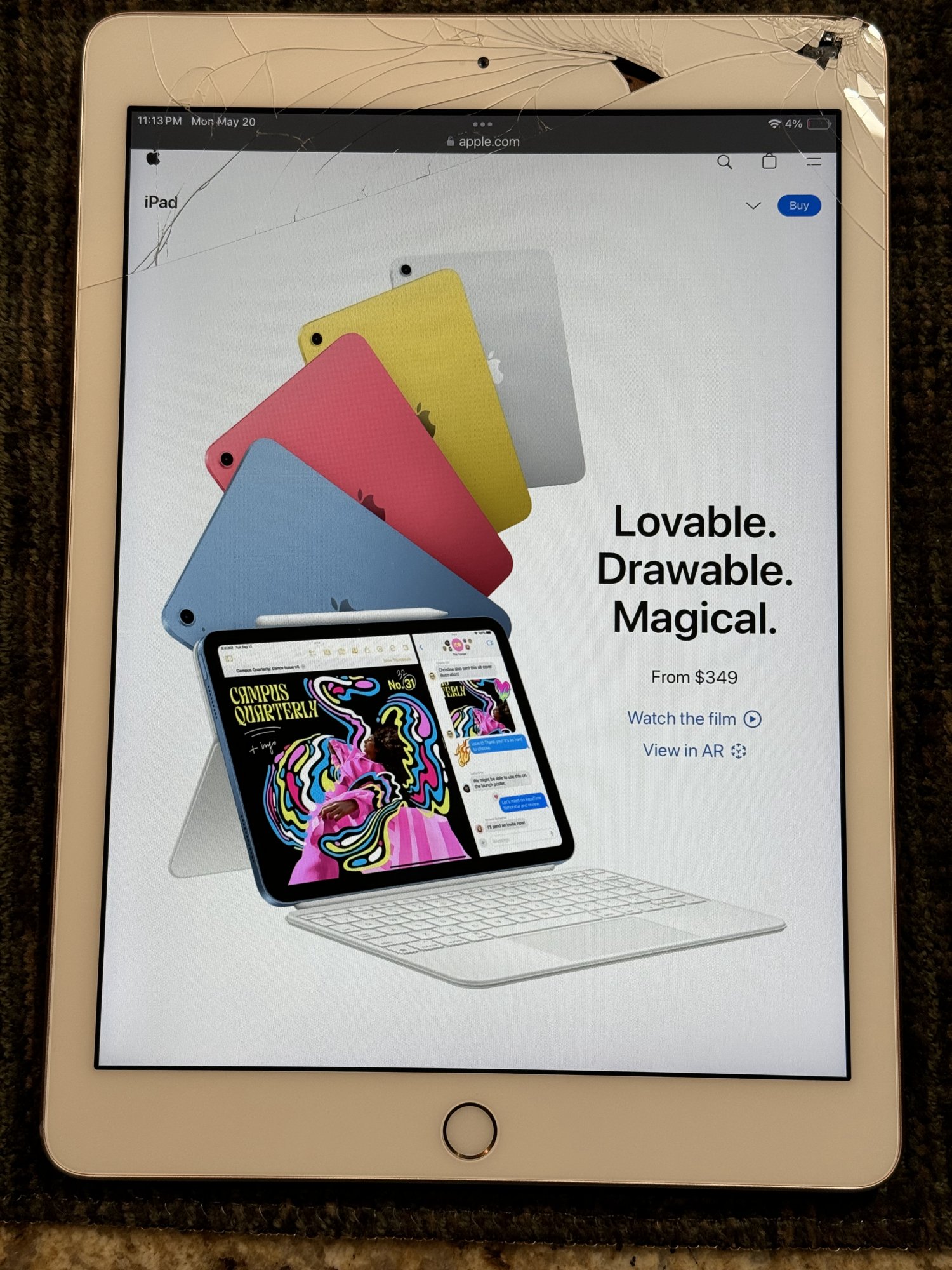 Move the timeline back to January 2019. I now purchase a 128GB, “rose gold” sixth generation iPad from the Apple Store refurbished section. Honestly, it was mostly for the latest(-ish) performance, although, now having a Retina-level resolution display, a thinner and lighter build, plus faster unlock with Touch ID were nice. Sadly and self-loathing annoyingly, about a year or so ago, the iPad flipped from my hands, landing corner first on a tile floor. I am still using this iPad about half the time, however, I will be retiring (i.e., Best Buy electronics recycling) in a month or so. If you dare look at the attached photo, the iPad definitely is no longer pretty but everything technically works, including the FaceTime camera and the entire digitizer. The continued use has extended the spidering cracks damage.