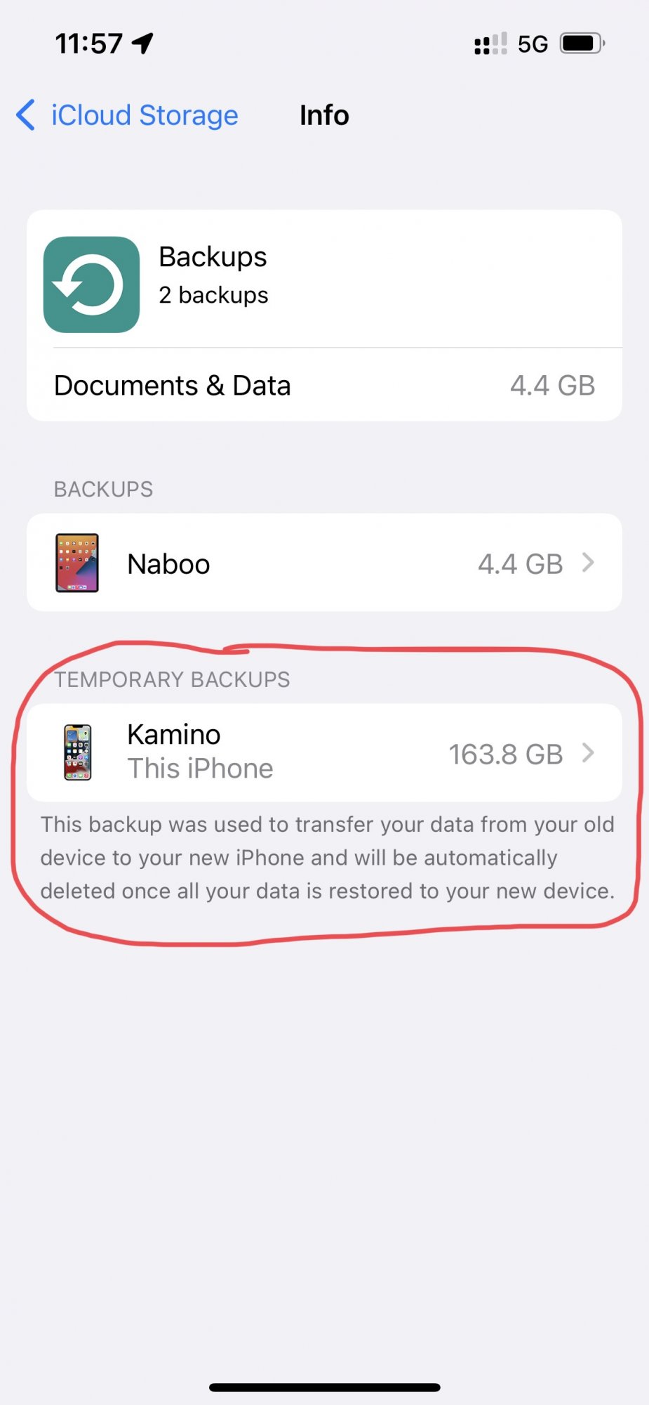 Now I’m on my new iPhone and it is still backing up to this “temporary backups”. I’ve deleted it and started over but it keeps going into temporary. Another strange thing is the backup is humungous. I use iCloud for everything (messages, photos, etc) so backups are only normally around 5GB or so. This seems to backup everything as is on my phone (backup is the same size as storage used).