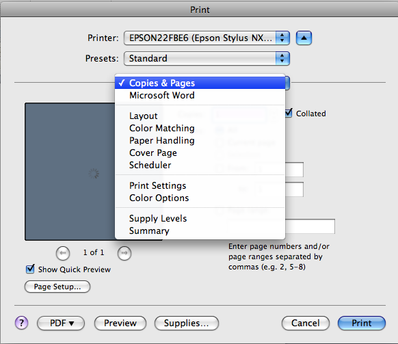 I have a new Mac OS X and have it hooked up via USB to an HP 5100 Deskjet printer. I have downloaded the drivers and installed them. Test documents all print in color but Word and all other documents print only in black and white. I cannot find any drop down menus, etc. to change print quality or settings ANYWHERE! I've spent days trying to google to find answers and have found nothing! Desperate here -- any suggestions for someone who is not a computer 'geek'?