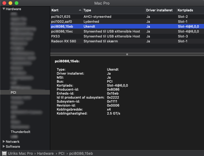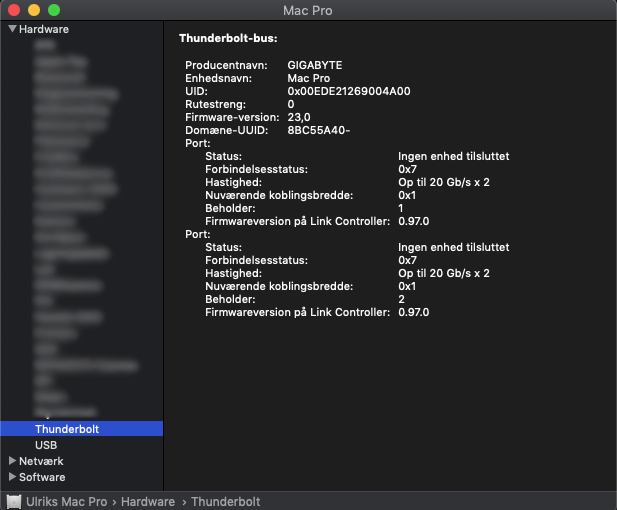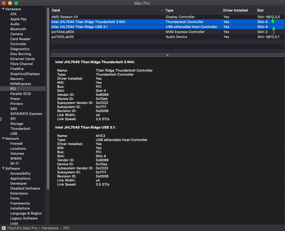 Seen as follow: 40gb/s x1 seen by the system slot 4 but also 3. Impossible also to mount drives etc etc even rebooting to recovery twice nada nothing i can't get a thunderbolt cable connected to a SSD drive as well