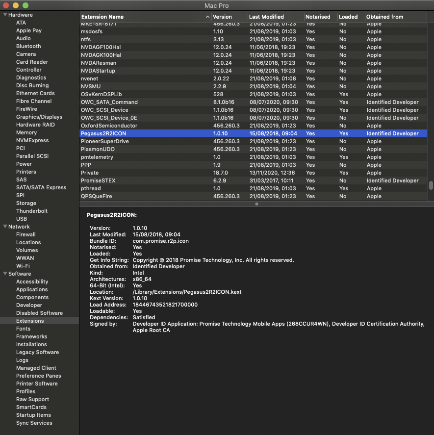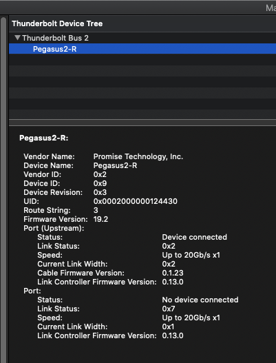 The funkiest behaviour is reserved for my Pegasus2 R4. At first, after installing the Promise Drivers and Utility, and using Kext Wizard to install the "PromiseSTEX.kext" file, my Catalina refuses to start - black screen after Apple logo. I then reboot into Mojave to "sudo rm" the incriminating kext from my Catalina volume. Prior to attempting the kext install, connecting the RAID box to either USB-C ports 1 or 2 causes my display to black out before my RAID box loads (orange light to blue, disk flashing blue), and then enter an infinite loop of reboot-error.screen.press.key.or.wait-reboot weirdness. After I removed the kext, Catalina strangely recognises the RAID box without any screen blackout, and I see this.