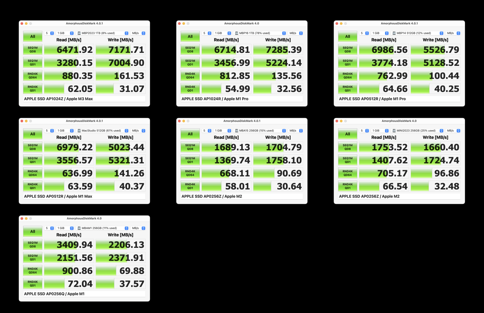 Here are the disk speed tests of an assortment of Apple Silicon Macs in our studio, configs can be 256GB / 512GB / 1TB. The most relevant metric for general computing is the "Random 4K QD1"at the bottom, and notice how this is almost consistent across all Macs, unlike the top sequential one which impacts large transfers. Screenshot 2023-12-25 at 17.17.47.png