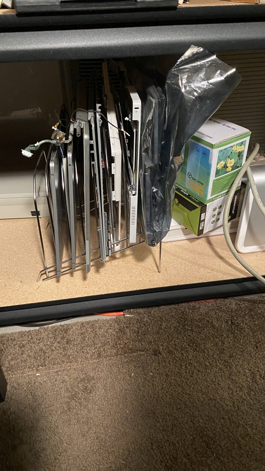 First pic of the dead would be an iMac G5, gifted by a member here. I had it at my old job and fully working. Came in one morning and it would not start up. I did basic troubleshooting and then abandoned it after pulling RAM and the HD. I suspect the usual - caps. Note, the LaCIE SCSI drive on top of it is fully working. 1GB, got it in 2002 when IT was cleaning out stuff at a former job.