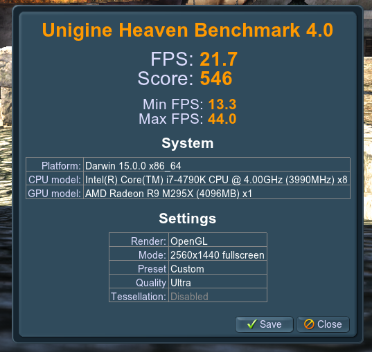 Old 2014 maxed-out rimac, (i7 4GHz/295x). Ran it through a couple of times to get the GPU up to temperature and then benchmarked when it was stable, with the fans very slightly on and the temperature steady at 99. Surprised you haven't had one of these on here yet. I only bothered doing this because I was surprised the 295X beat the 395X at Cinebench just slightly. Same results with Heaven: