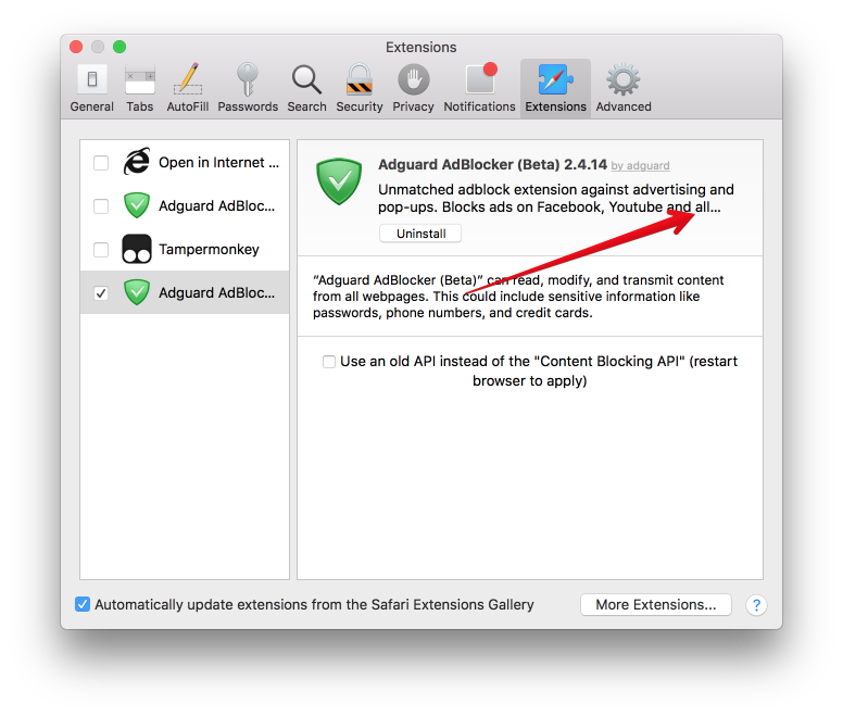 This is where I believe you are making a false connection - from what I understand about how safari extensions work, certain permissions are an all or nothing type of choice. So if you want your blocker to inject JavaScript and/or modify CSS, the extension needs full access.