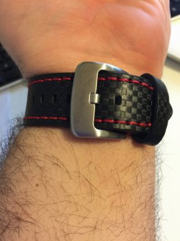 View attachment 599078 Got an awesome strap from Black Forest on etsy. Sent in my measurements so it fits perfectly, and I even asked them to put on a black buckle which they did for my space black stainless steel.