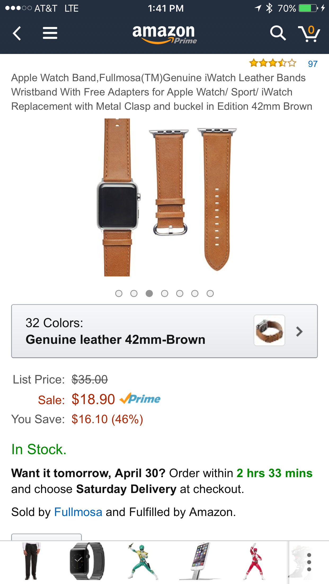 Another big time thank you to you!! Got the band yesterday, and it feels and looks fantastic. I'd been looking for a cheap($75 or less), even used, Apple Saddle Brown band on eBay for weeks, but this band is even more of what I wanted. Supple, soft leather, great tan color, Apple-style oval buckle, 2 loops, and spring bar connectors - just perfect. And at less than 1/3 of the price, shipped. I swear if they made more colors I'd get black, storm grey, and midnight blue.