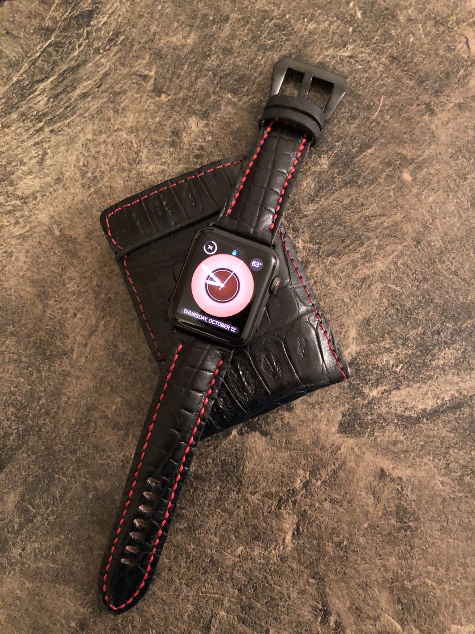 If you’re into exotic leathers, this place is amazing and the owner Jay Green is a great guy. If you have a specific color combo he will take custom orders. The watch is the series 3 SG LTE model.