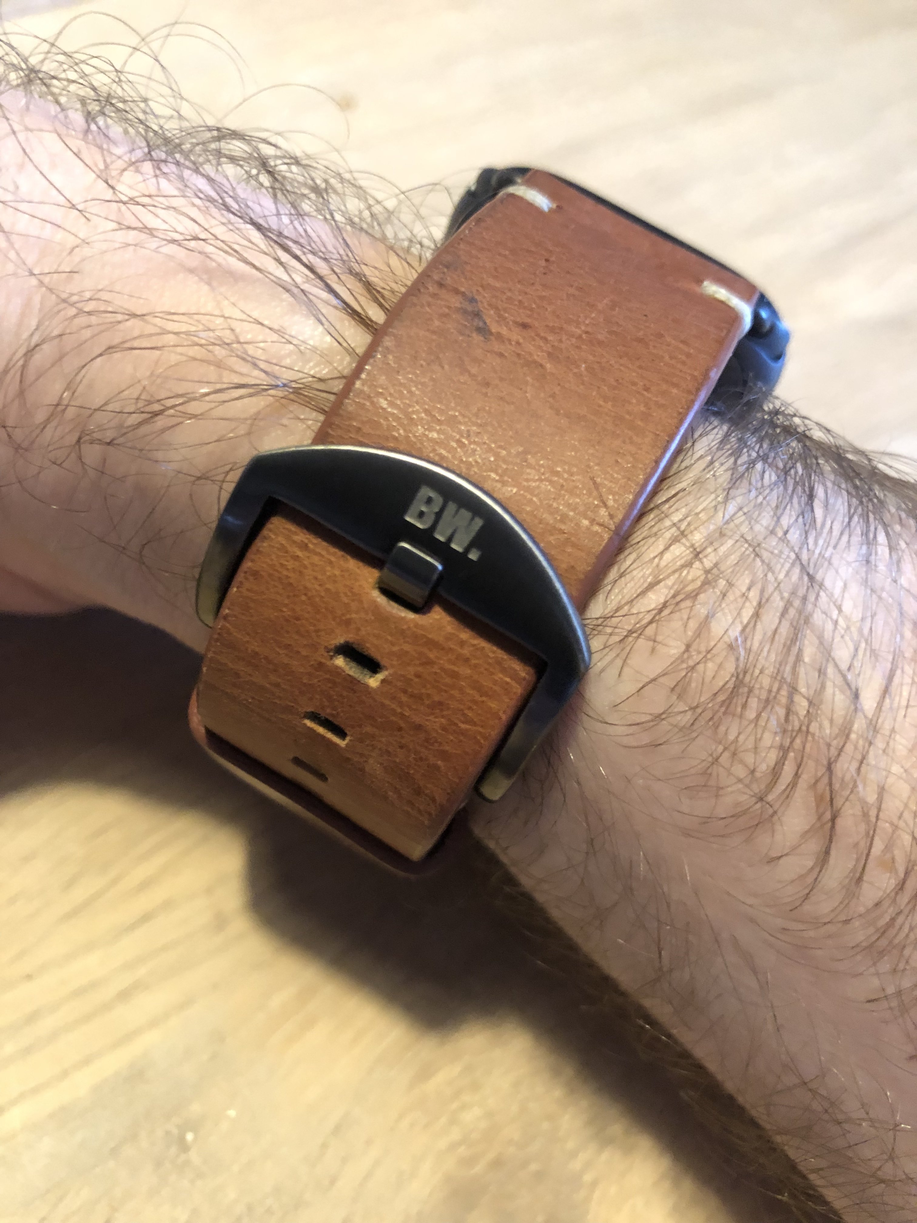Got it today, looks very nice in person. Smooth and soft leather. Like all brown (tan) leather, it will wear very nice. And the patina will be better when it is worn. The only complaint is that It is a bit to wide for my narrow wrist. But this is me having puny wrists. Another complaint is the BW logo on the buckle, but that might be solved...