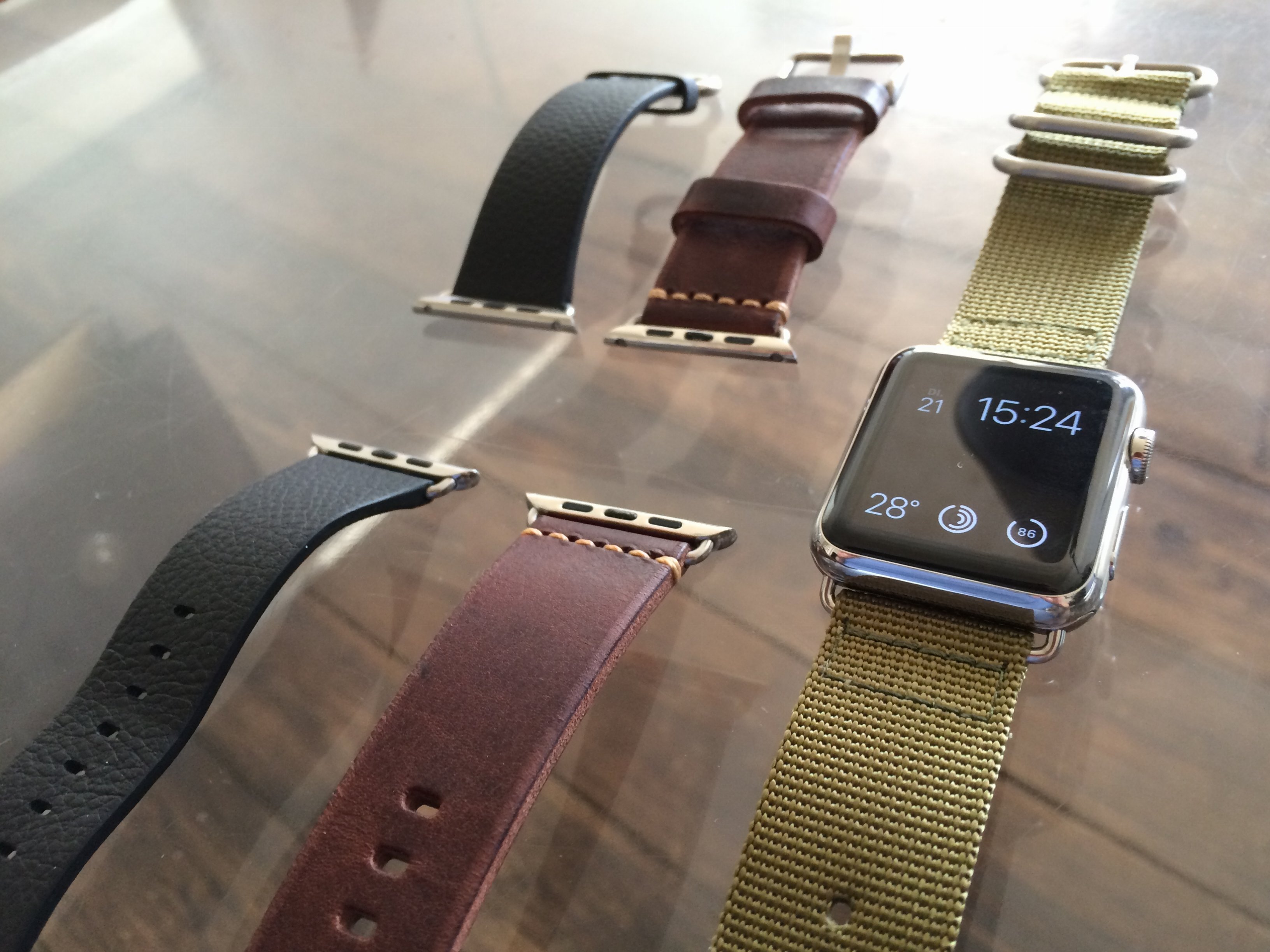 Default apple black classic buckle, 3rd party thick brown leather, 3rd party nato strap.
