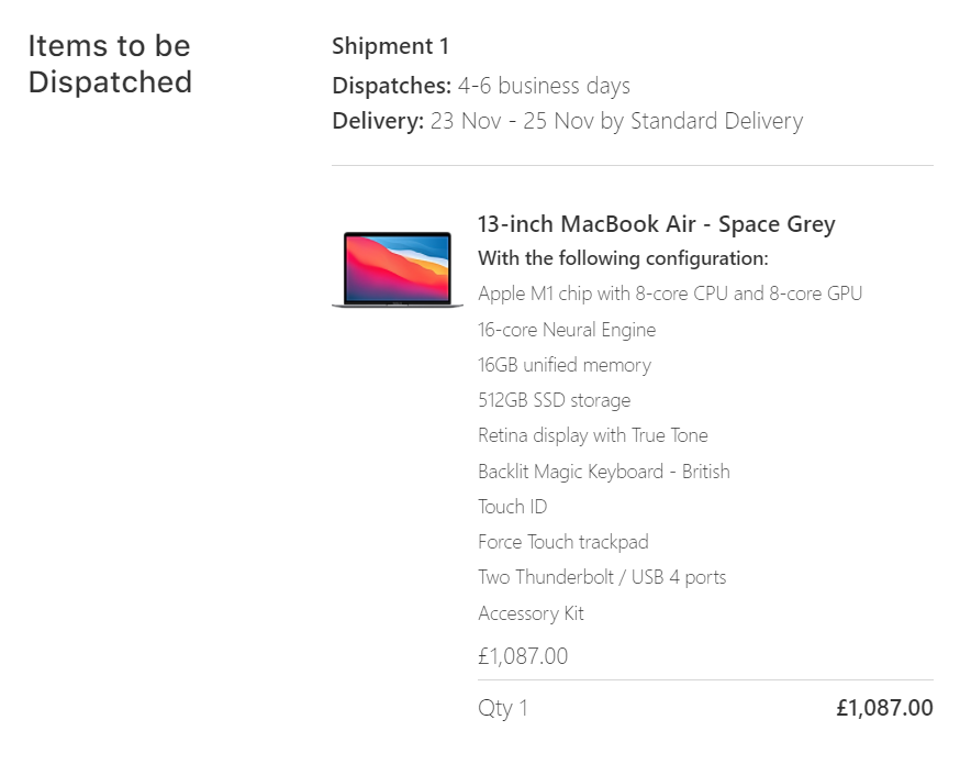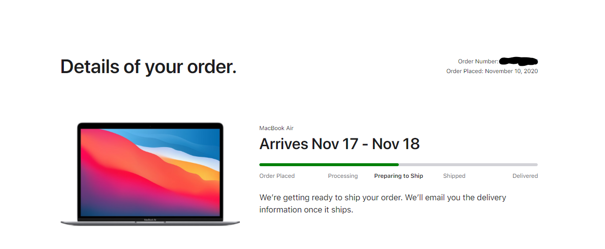 I ordered the base config M1 MBA yesterday, 11/10/20. The current status is "Preparing for shipping" and ETA is: 11/17/20 - 11/18/20.