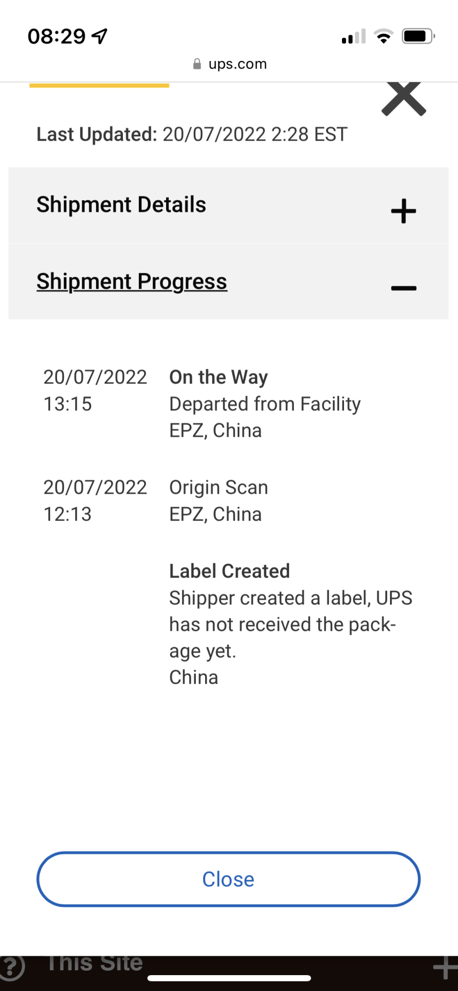 this step should be visible as at least arrival / departure in korea. In the most cases (all for me) UPS does not mark it as departed from China but that could also come up, meaning it is definitely in 5X11