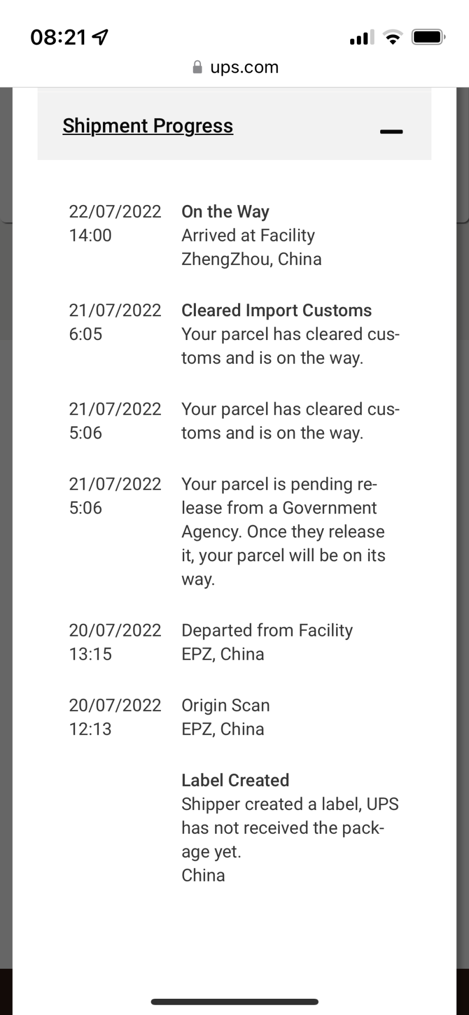 this step should be visible as at least arrival / departure in korea. In the most cases (all for me) UPS does not mark it as departed from China but that could also come up, meaning it is definitely in 5X11