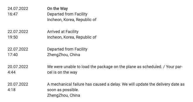Also notice that 5X11 is just the callsign, meaning even if the current machine doesn't have your MBA and is on the way back to Seoul (as 5X20 I guess), there's already a new 5X11 arriving in Shanghai as 5X10 changing to 5X11 for your package.
