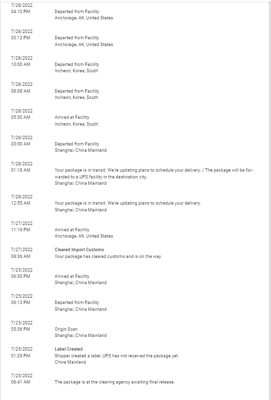 Midnight MBA 10/24/2 (fully loaded) ordered within 5 minutes of preorders at on the apple education site. Initial estimate was Aug 2-9. My apple card was eventually charged on (i believe) the 24th and within a day it was preparing for shipment. Est delivery was updated to Aug 1-8. Was shipped via UPS International saver or whatever it's called. Initial estimate when UPS got the label on the 25th was Aug 29. Below is the shipping progress pics. Throughout the course, apple held steady on ship date. UPS would change from the 29th to 27th to 28th depending on whatever the system felt like putting in (LOL I'm sure it was probably some system estimate, but it didn't seem to correlate to anything). After it cleared customs in China, suddenly UPS said estimated delivery unknown, and my guaranteed window was canceled. That was on the app and details, however on the overview in the UPS my choice app it continued to show the 28th. Once it left Incheon and got to Anchorage, UPS updated the delivery day to the 29th. That ended up being correct. I live in a fairly major city (Norfolk, VA). I'll check back once or twice in the next few days in case anyone has any questions about my progress, but I hope this helps someone.