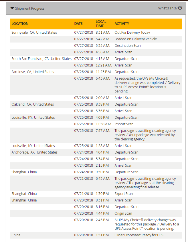 Hey gang I just wanted to provide a quick update for anyone that is trying to track the shipping windows of the new MBP. I ordered at night on the 20th with a projected date of Aug 1st. I received a tracking number on the 24th with a new target date for delivery on the 27th. It arrived a day early (exciting, but frustrating because I arranged to be home to sign for it on the 27th). Regardless, I was lucky enough that the Fedex driver stopped by when my was home on her lunch break so at least someone was home.