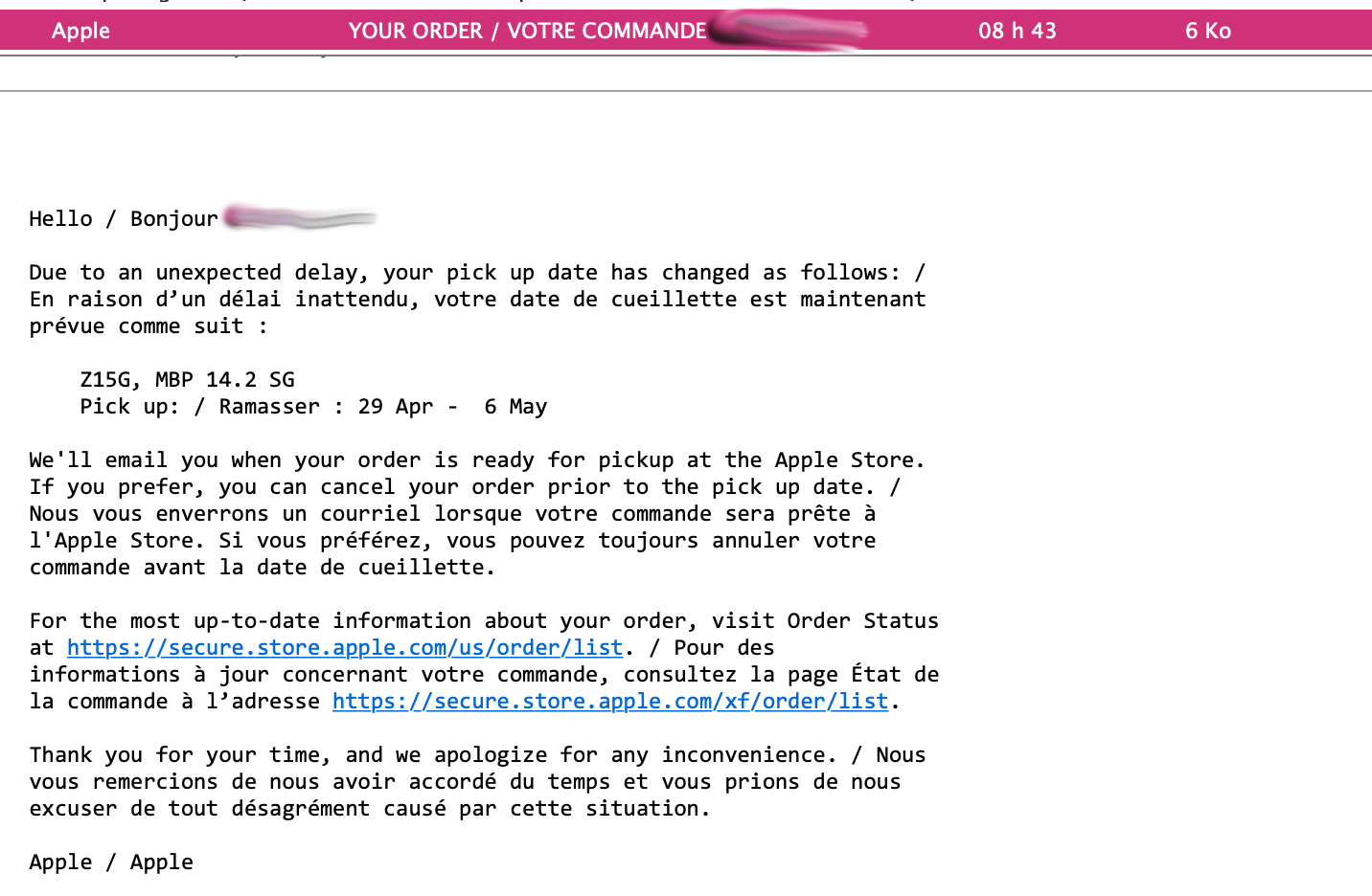 I found a local official Apple reseller had a new one in stock with the exact same configuration, except 2TB instead of 4TB SSD. I decided to pull the trigger and place the order, with local pick-up on Tuesday and payment in store. I still have not cancelled my first order, will do on Tuesday as soon as I have the other one in my hands and confirm it is in perfect conditions.