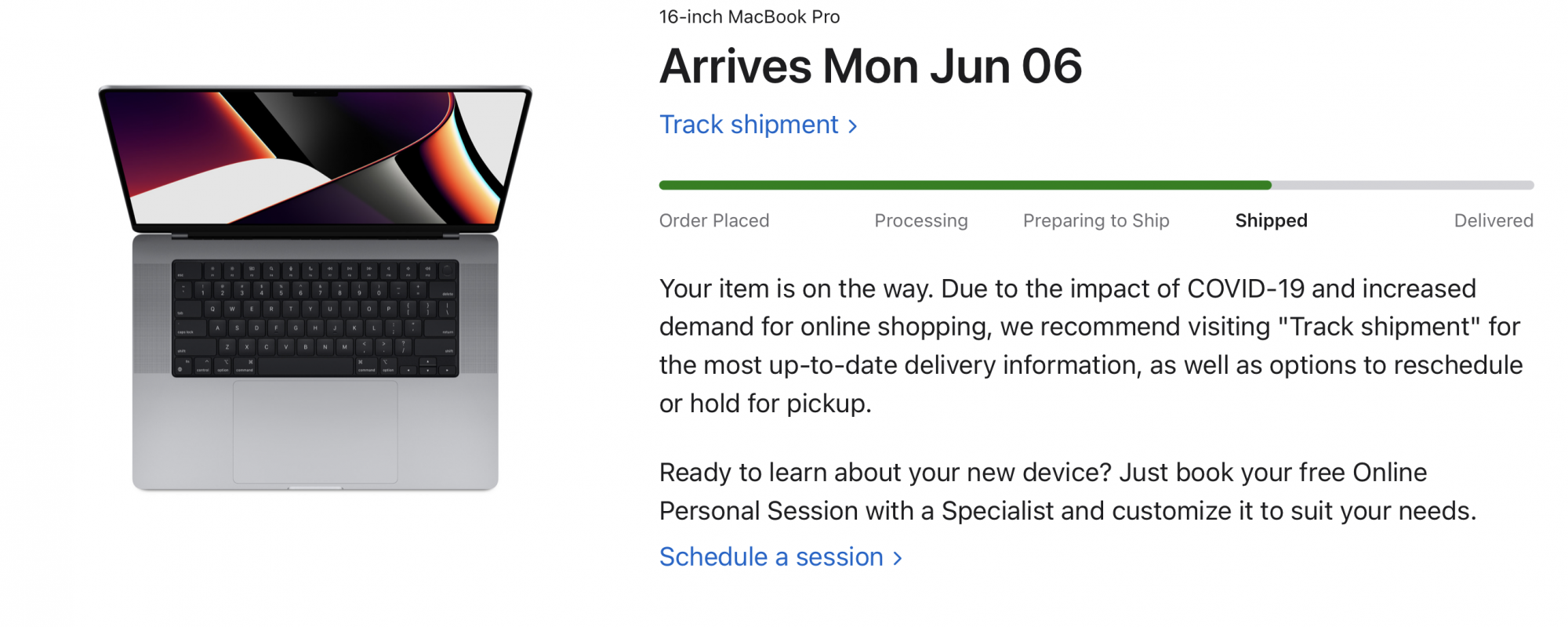 Going full stupid May have paid off! My laptop shipped and should arrive on June 6th! Now, if they announce the M2 MBP, I guess I can sell this one still in box. But I’m hoping any announcement of an M2 16” MacBook Pro will be for delivery next year.