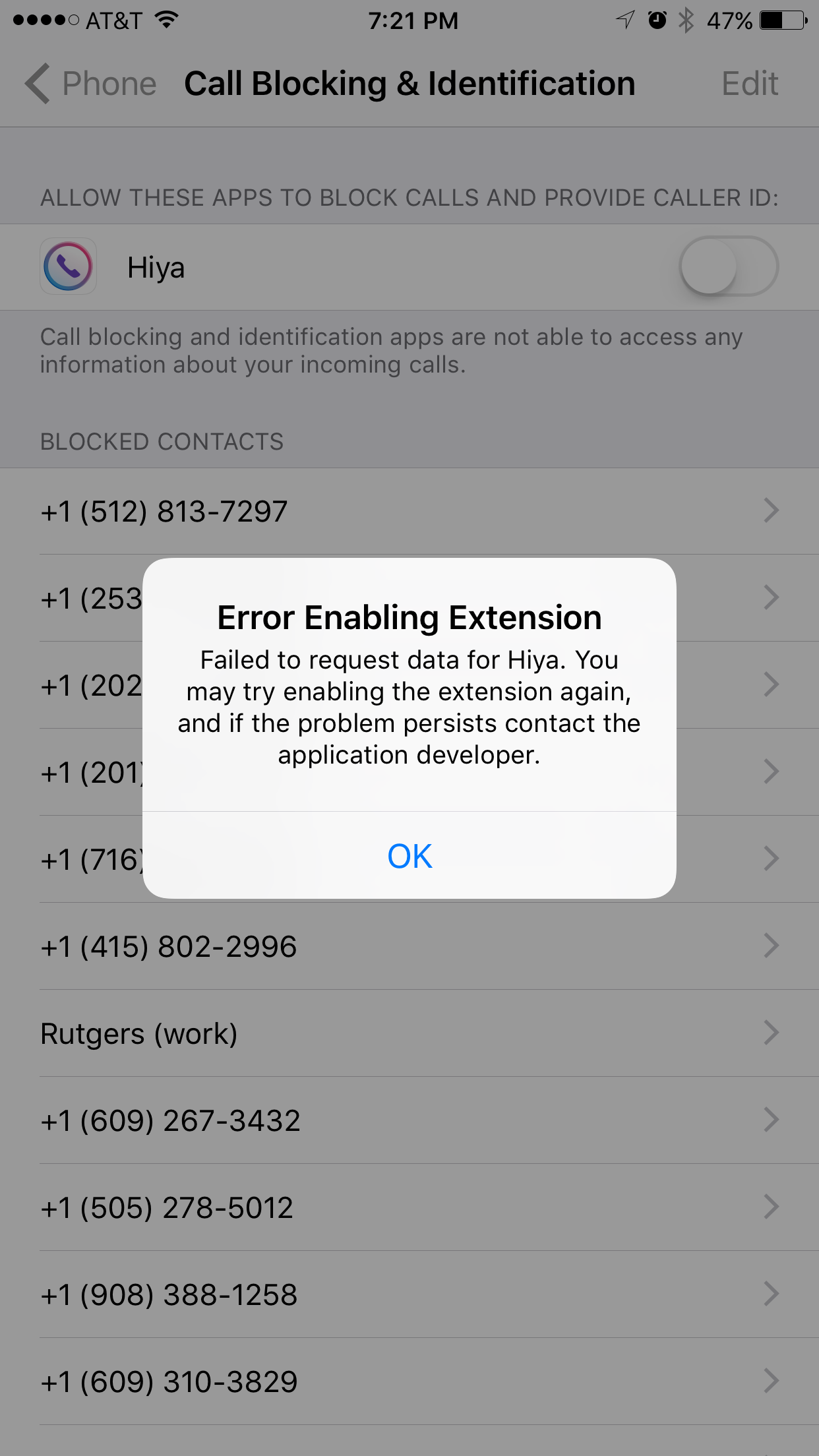 I'm still having a problem with this version that I had in the previous version where if I disable Hiya under "Call Blocking and Identification", I can't re-enable it until I uninstall the app and reinstall it. If I just try to enable it, I get a spinning gear for a few seconds and then it shows as disabled again. This persists even if I restart the phone. Once I got the following, but usually it just disables itself without any errors: