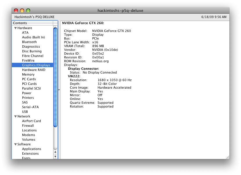 At the moment my Hackintosh 10.5.7 is working perfectly except System Profiler still shows "there was an error" in the Hardware tab and I can't get sleep to work properly (no display after wake up).