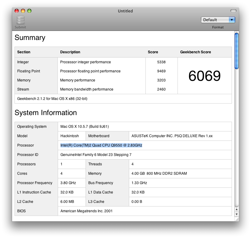 I love the "about this Mac" window! Mine shows some similar numbers with the CPU / Memory. OSX86 Tools has a Fixer that will auto dectect CPU / Memory and fix the numbers for you.