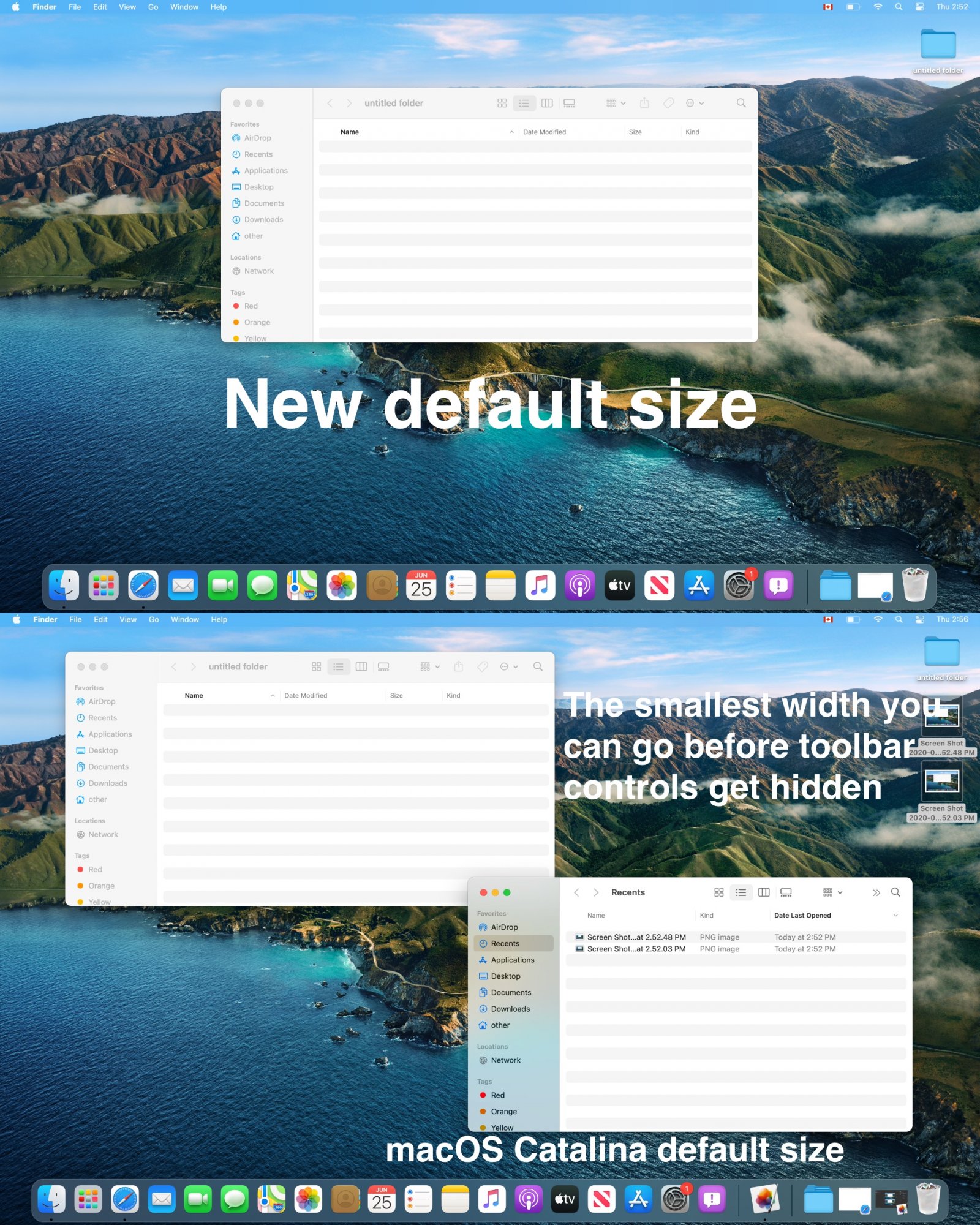 Craig says the new Finder has a more space efficient toolbar, but its not space efficient if the controls are hidden. In fact, the default Finder window size is soooo wide, because the buttons take up so much horizontal space.