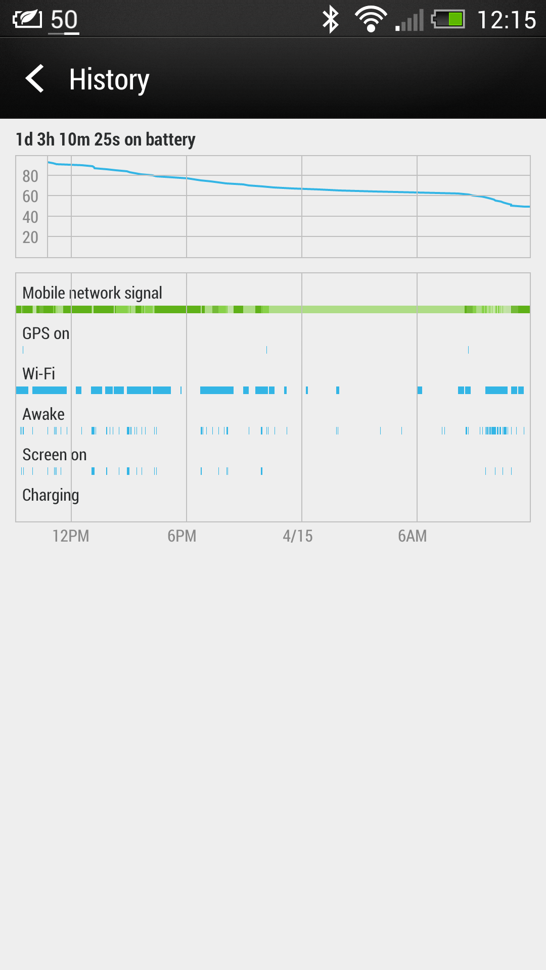 As a side note, I'm doing a life test on my battery to see how long it will last doing medium usage workday use out of the HTC One. So far I'm 1 day 3h 10 mins with 50% left.