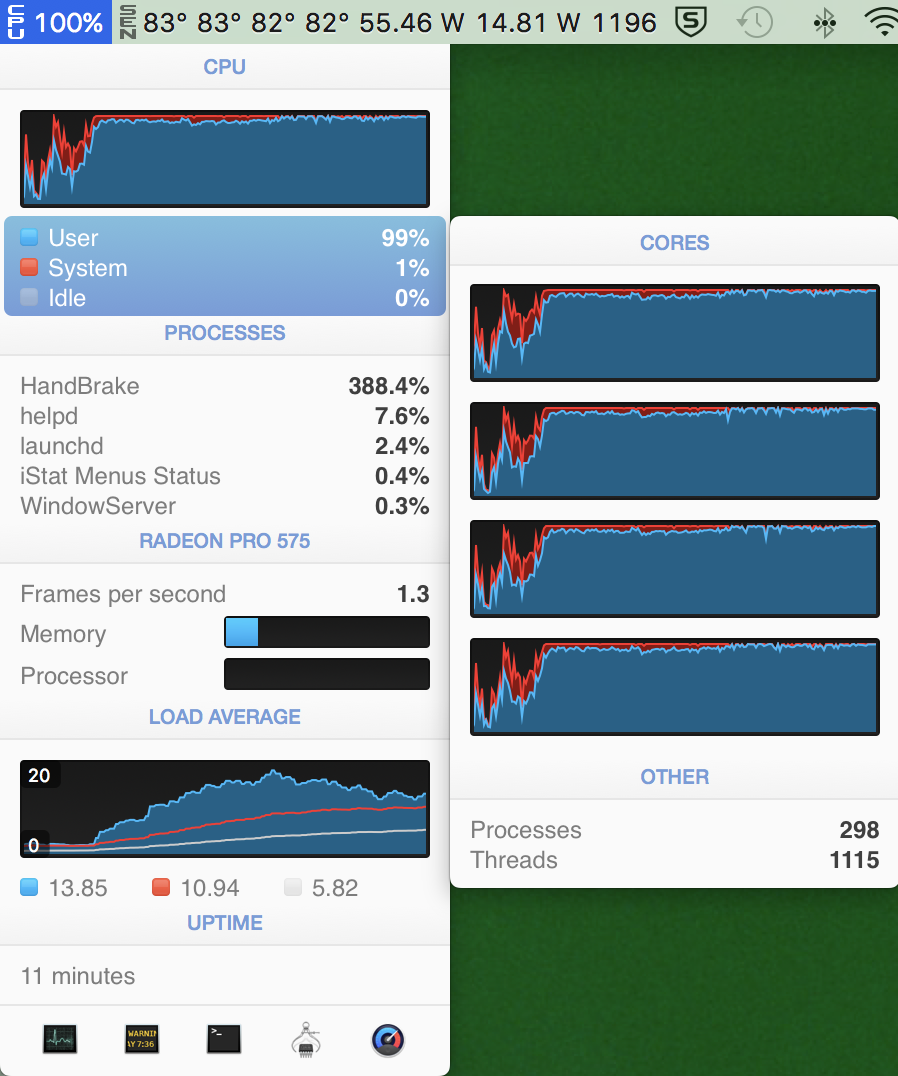 The big difference though is this thing is silent under heavy loads, at least for a good while. Just for fun I loaded up the latest Handbrake nightly and started a transcode of 4K HEVC to 1080p HEVC. This pegged the CPU at 100% load. After about ~10 minutes of this, the fans were still at 1200 rpm (minimum), and the temps were in the low 80s C. I never once saw the power utilization exceed 60 Watts. It hit about 57 Watts a few times, but most of the time was in the 52-55 Watt range. As you can see from the screengrab, the CPU was using over 399%, with Handbrake taking 388% of that.