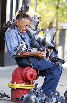 Many of you who read the political forums know that I recently moved to a new neighborhood in Chicago. This man is one of the reasons I love it so much. I first saw him a few weeks after I moved here and just thought he was one of the most interesting things about the neighborhood. He would always sit in the same place and feed pigeons, but they seemed to really like him. They would sit all over him and he seemed to love that. Most people would be horrified at the thought of a pigeon sitting on them, but not this guy. Everyone in the neighborhood always talked about him and how much they liked seeing him around all the time.