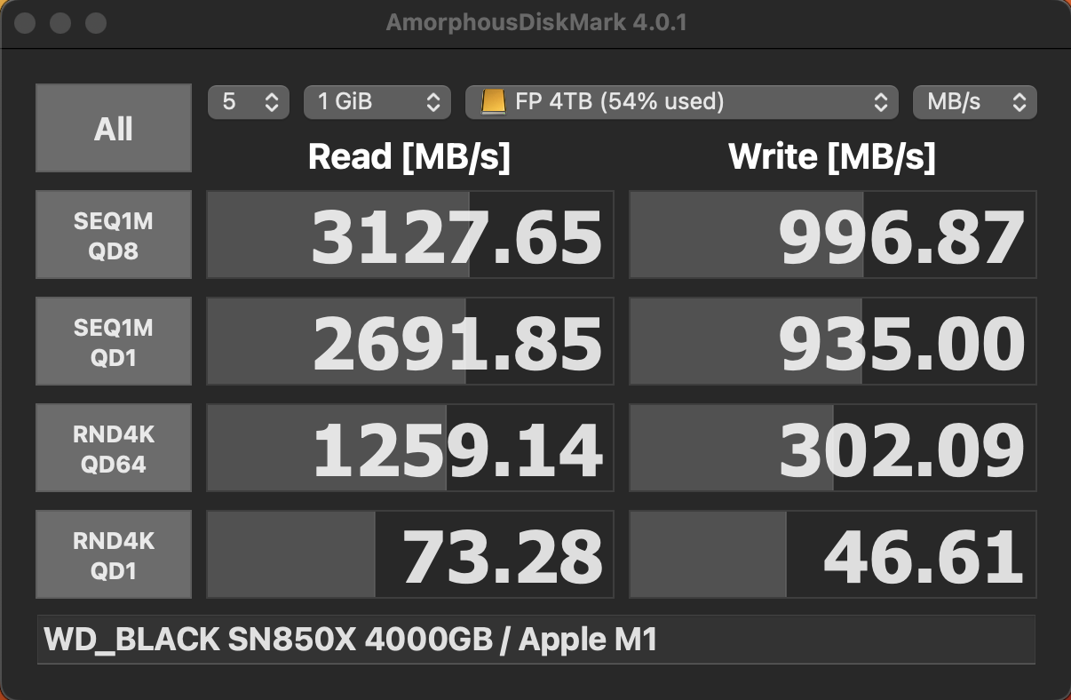 I wonder about my results using TBU-405/SN850X 4TB. I get significantly worse write speeds than you in Amorphous diskmark, but it looks fine in Blackmagic Disk Speed?So my WD SN850X 4TB arrived, I put it in the TBU-405 Pro M1 for some tests.