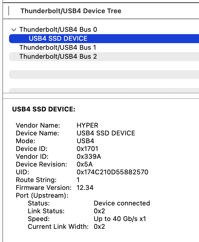 Hooked it up to a 2020 rMBP and got nearly exactly the same results, so it looks like HYPER just punted and shoved in a TB3 chip and hoped no one noticed.. System Information does identify it as a USB4 device, though.. maybe the cable is crap? Will order a Cable Matters USB4 and see if that helps.