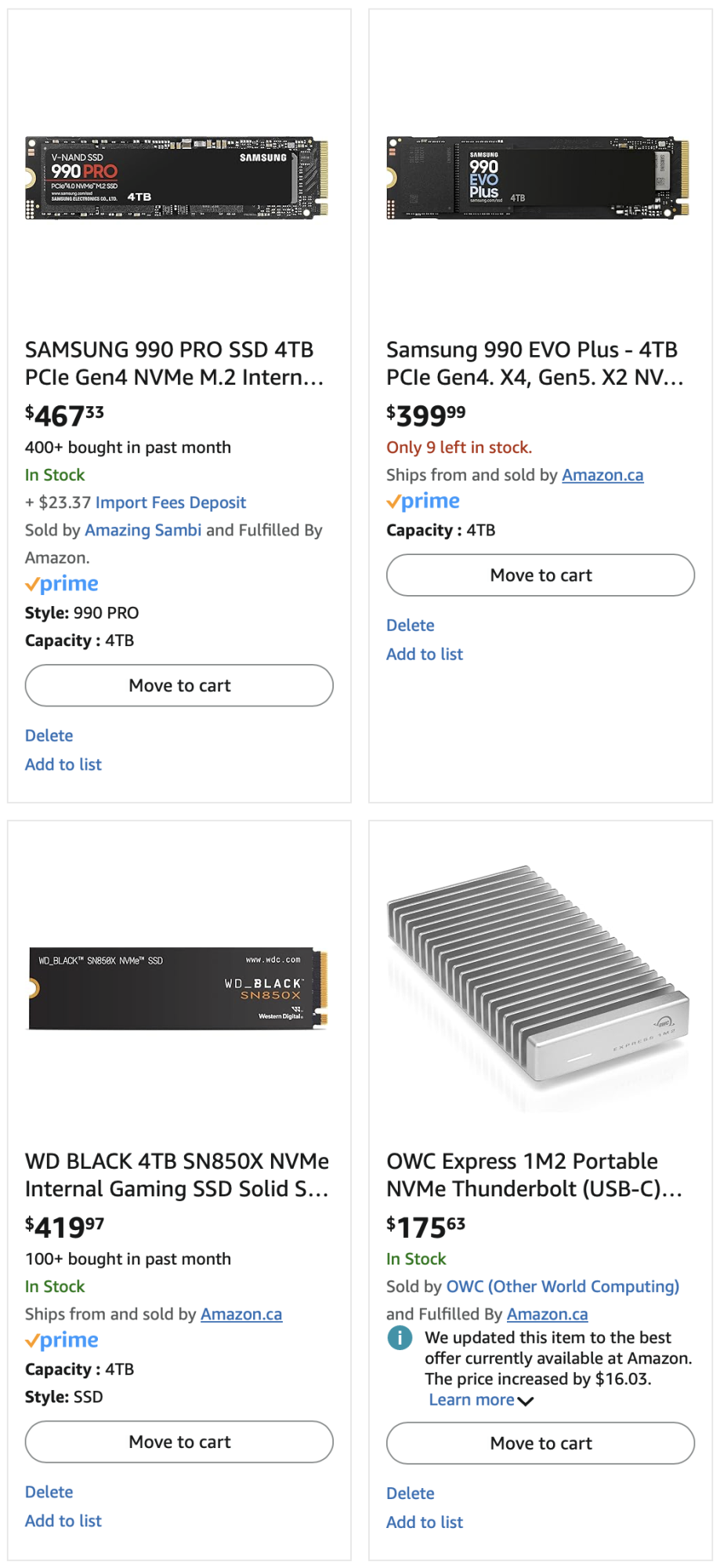 Occasionally the Samsung T series 8 TB drives are on sale for a bit less, but they won’t be as fast.Hey guys, tell me if I have this right after looking at your suggestions. If I buy two of these MAIWO USB 4.0 40Gbps M.2 NVMe SSD Enclosure Aluminum enclosures and two WD 8TB WD_BLACK SN850X Gaming Internal NVMe PCIe 4.0 SSD they will work on a new Mac Mini M4 and I'll have 16TB of screaming fast external SSD's? I have an old Drobo that's going to fail any day now and I want to get my stuff off of it. If I'm understanding this right, this is the fastest/cheapest way of getting two separate 8TB SSD drives for a Mac correct?