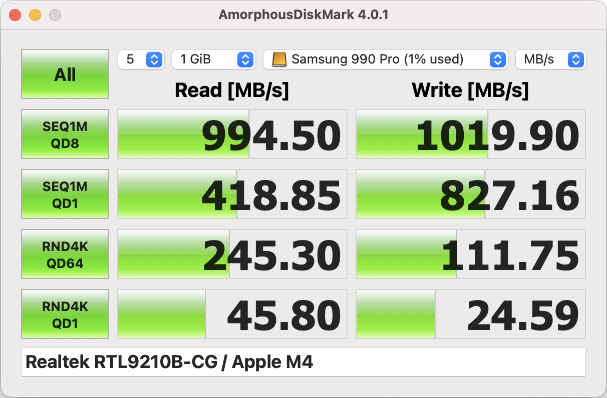 Something to keep in mind about the twin front ports. On my M2 Mac Studio Max, which has 4 TB ports in the back and 2 USB-C 3.2 port in the front, I have come to find the 2 front ports are split off from 1 USB 10Gb/s controller, so R/W speeds with both ports in use can at times be 10-20% less what a single 10Gb/s port can do. I had planned to pair up 2 Samsung T7 Shield 4TB drives and run them as a 8TB RAID pair off these ports and hopefully get at least R/W comparable to what a TB port can produce. Now instead I have a OWC TB hub with 3 TB ports, using 1TB port to feed it, and hook them up to this. Speeds are a bit faster off the Hub at 850-900 Mb/s vs 750-800 MB/s with the front ports.So I just tested this on my M4. I didn't do a lot of testing, but I get the impression the rear Thunderbolt 4 ports may be a bit faster than the front USB 3.2 ports, despite all of these drives being USB 3.2.
