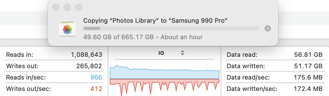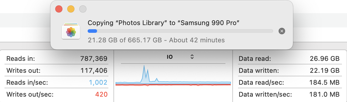 I transferred my 665.17 GB Photos Library from my Samsung T7 Shield to the new USB 4 Samsung 990 Pro. It took 29'45" for the complete process, or 29'11" for the actual transfer (since it took 34" for the transfer to be prepared). So that means a transfer speed of 373 MB/s or 380 MB/s depending upon how you calculate it. However, the speeds and behaviour really ranged, probably because of the types of files transferred inside that library. Here are the various transfer speeds at different points in time during the transfer. The graph shows the variability in the transfer speed.