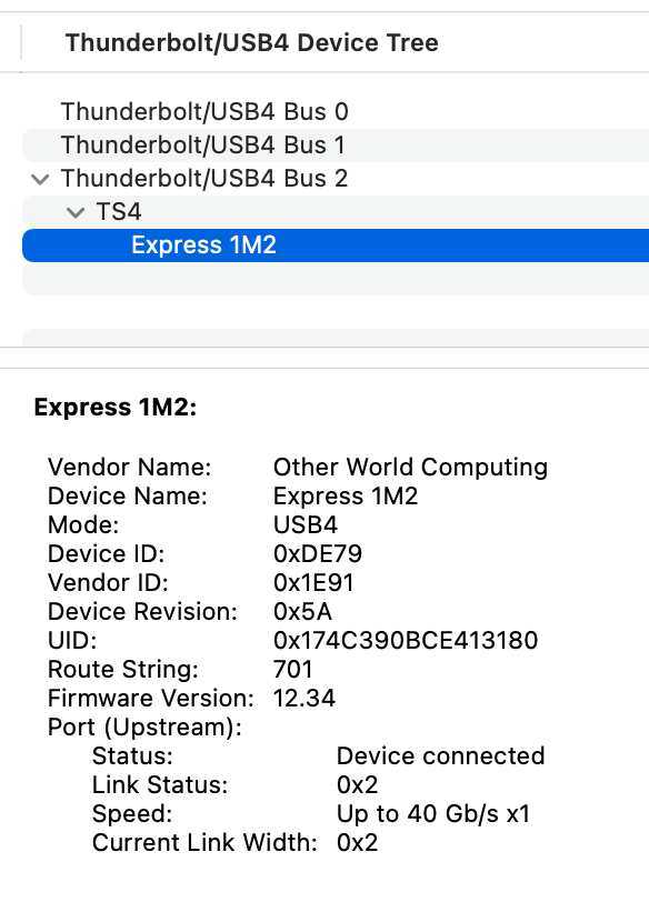So, with that enclosure, I get TB when attached directly to the MBP, but USB when attached to the TS4 (no matter which cable or port is used). Meanwhile, the other Express 1M2 does give me TB on either TS4 port and either cable.