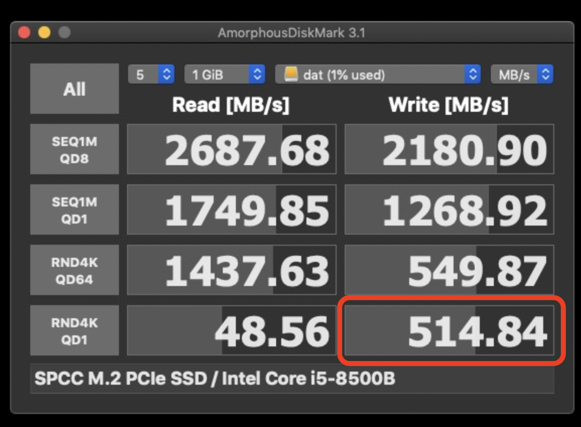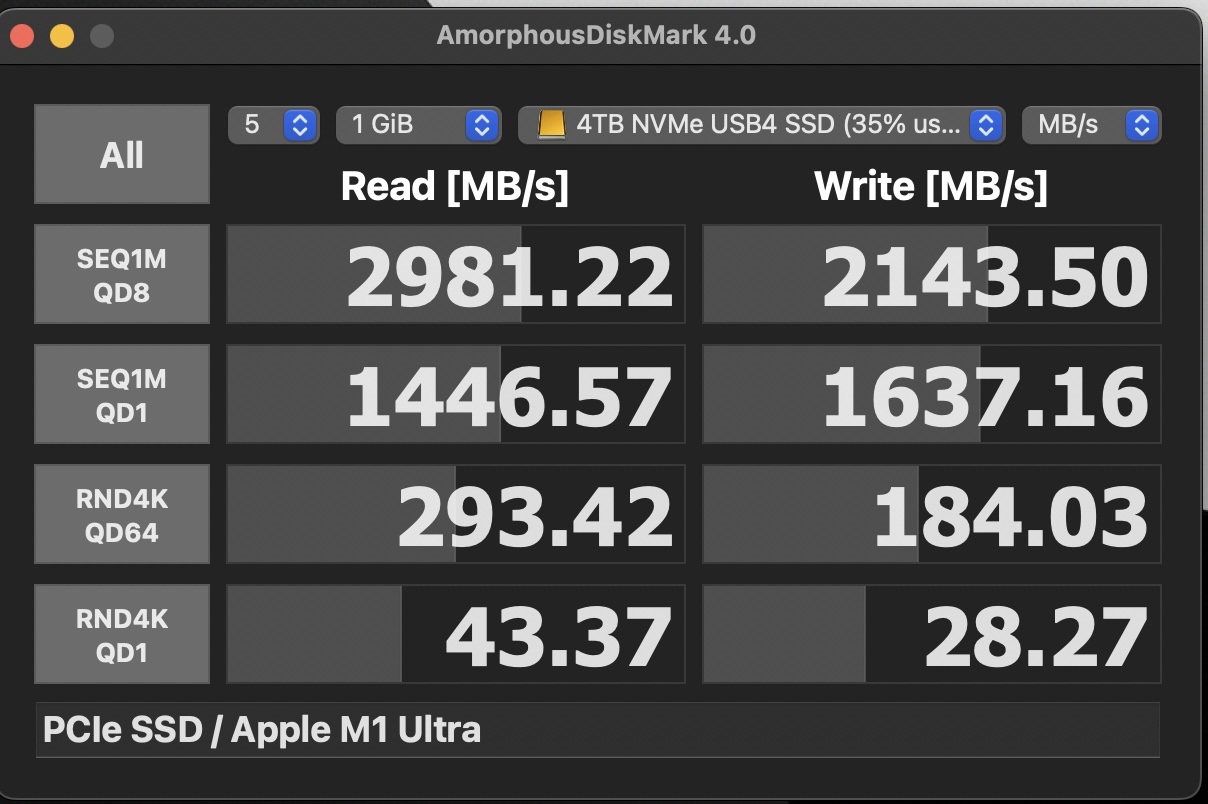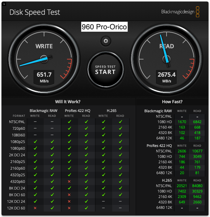 I bought the Orico USB4.0 NVMe SSD enclosure and a 1TB Samsung 980 Pro SSD to add to my external drives. Before putting the 980 Pro in the Orico enclosure, I tried the 960 Pro in it to see if the bottleneck was the Envoy. As you see in the attached screenshot, the read speed improved dramatically, from apex. 1550 MB/s to 2675 MS/s, but the write speed stayed about the same, 651MB/s.