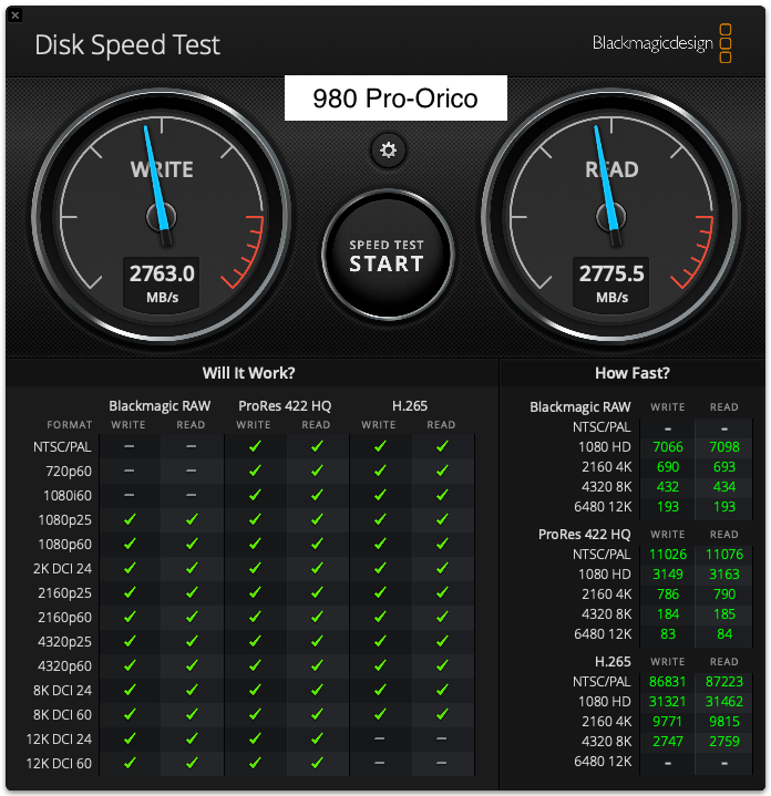 Everything improved when I put the 980 Pro in the Orico enclosure with 2736 MB/s write speeds and 2775 MB/s read speeds. I am happy with that result. All test were run with the drives connected to a CalDigit Dock.
