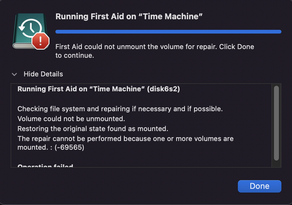 I have tried running first aid on the disk through disk utility, but get the below error which appears to be simply failing to unmount the disk. If I try to unmount the disk, I get the message "Failed to unmount “Time Machine” because it is currently in use by “Finder”."