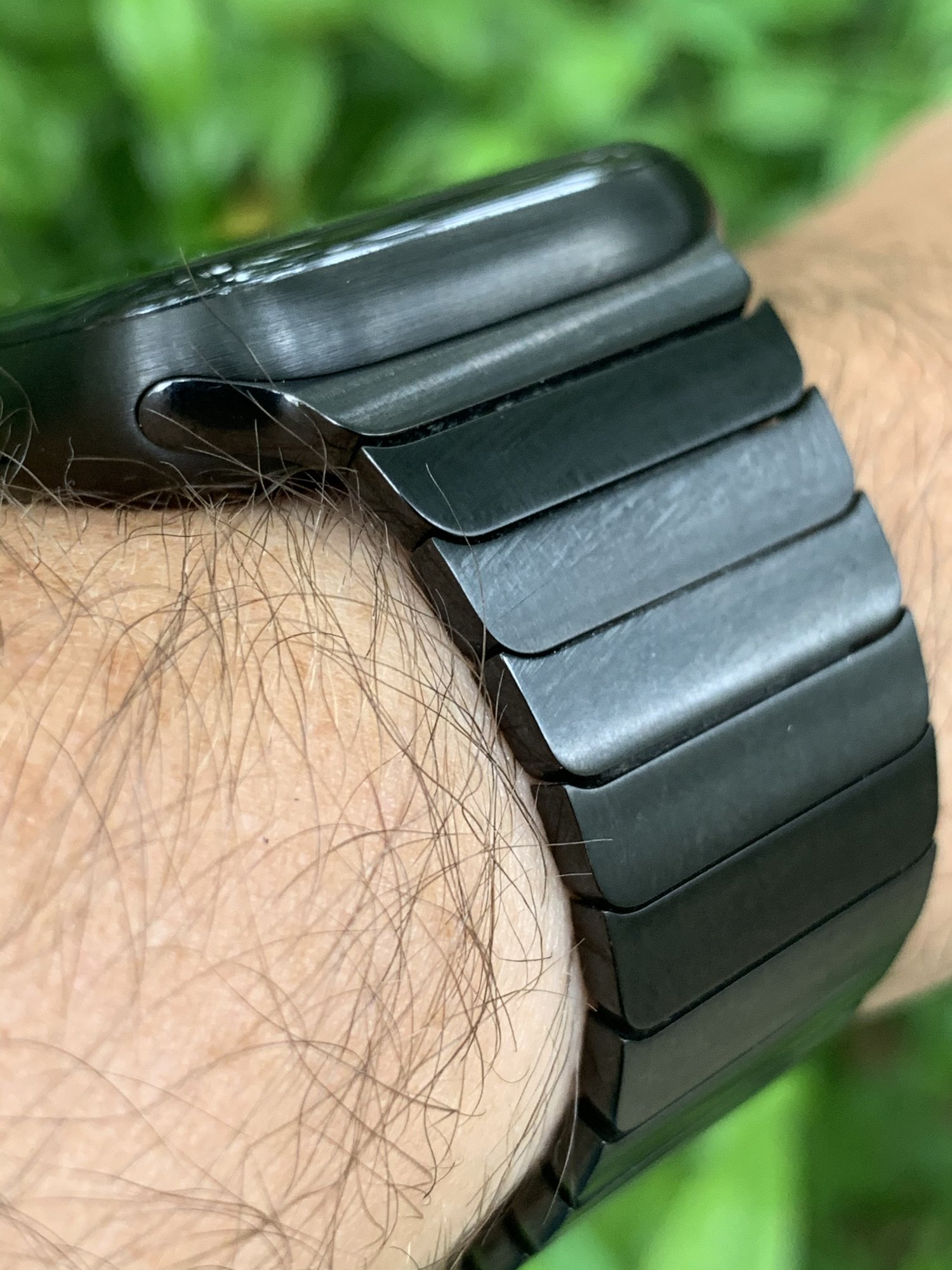 But otherwise so far, first Apple Watch edition, I like it, I love that, how like Graphite SS, it has the effect with lighting depending how light or dark the situation is, it can have two different looks, like a chameleon. It can either take on SBSS' appearance of a full black body indoors (albeit matte look instead of gloss), or it can look lighter in the sun and you see the brush effect. It's neat. Coming from SS, the difference in weight is a very welcome change.