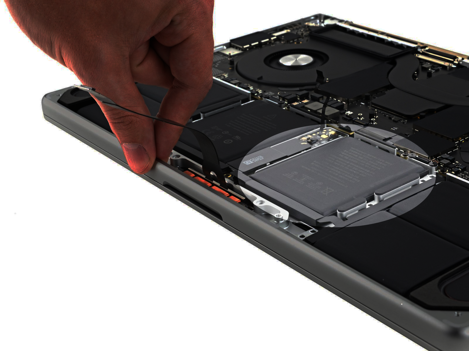 In your case, the steps you’ll need to follow are Steps 1–7: you just need to be able to visually inspect and to touch the six cells. If I were to take a guess, the cell on the “right” side of the trackpad (as seen while the laptop is resting on its lid) might be starting to swell (highlighted in the oval below):