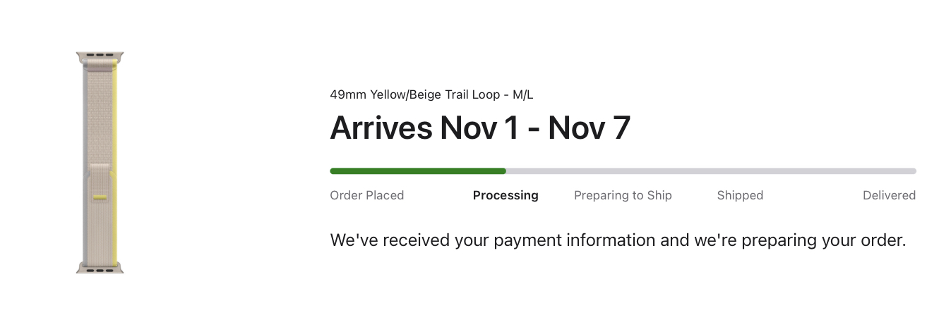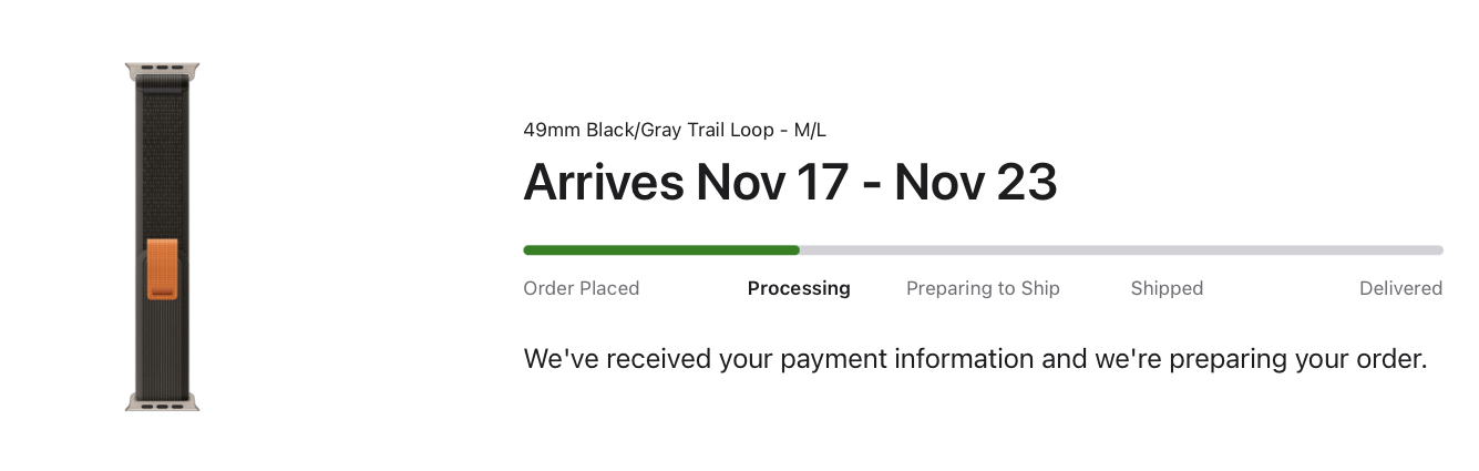 My Amazon Black Trail Loop is showing "By October 31." Also ordered on launch day.Not from Apple but my Amazon order I placed around launch day is showing a 10/27 delivery estimate. Blue TL.