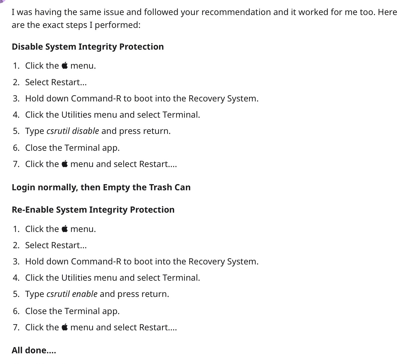 Above is what I get when emptying the trash. The general trash IS EMPTIED, however then I get the three error msgs onscreen, one at a time, shown in the image. If I look in the trash I see the topmost picture of the mbpro1118 folder which, if opened via the arrow at left, is empty.