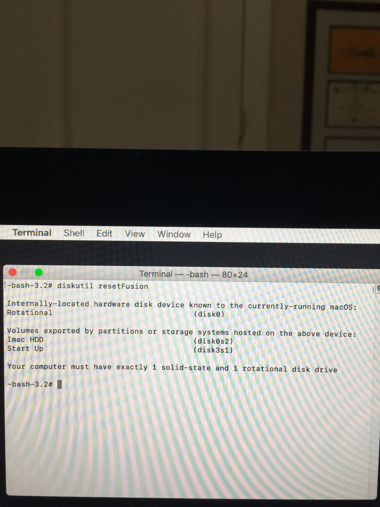 I read about the diskutil resetFusion command in terminal and tried to unite the two drives. But that failed and I got these results. Any ideas on what to try next would be appreciated. Thank you.