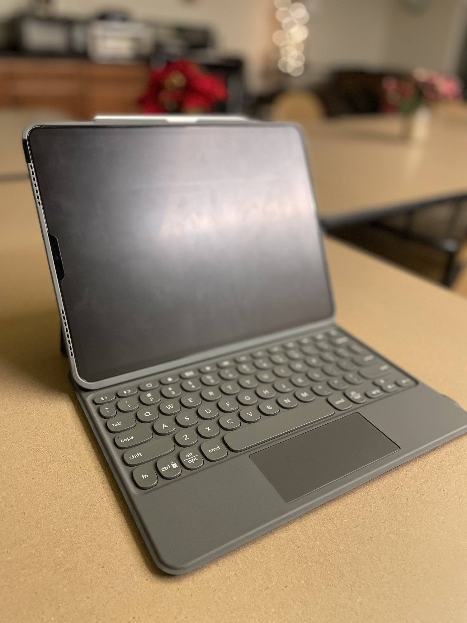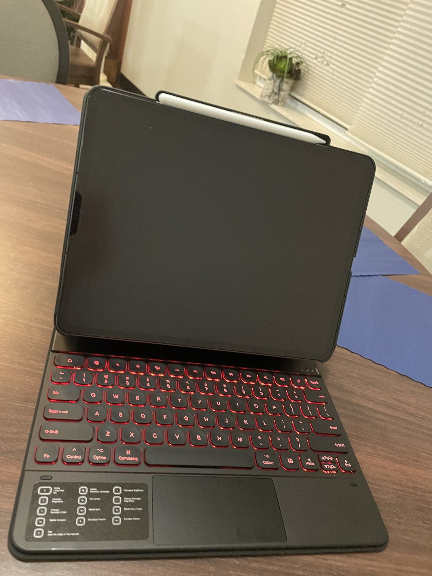 It's "okay". Keyboard connects to iPad via Bluetooth. Keyboard wake seems to have a tiny delay of course, but after that, it's instant. I'm coming from the Logitech Combo Touch (first iPad Pro 12.9 5th version), so it has the slightly warped rubber around the speaker sections. I had that one for 2.5 years. Loved it, but wanted to try something different.