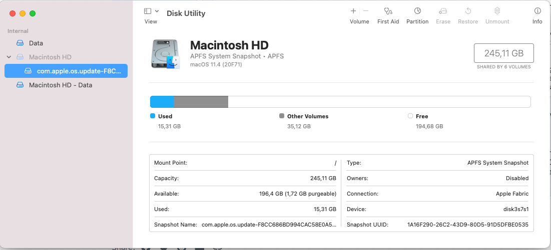 2. MacintoshHD-Data. This one contains everything else, including some user specific "system" configurations. SOme users reported having multiple Macintosh-Data volumes, one per each user. My systems have single such volume, but also only one real user.